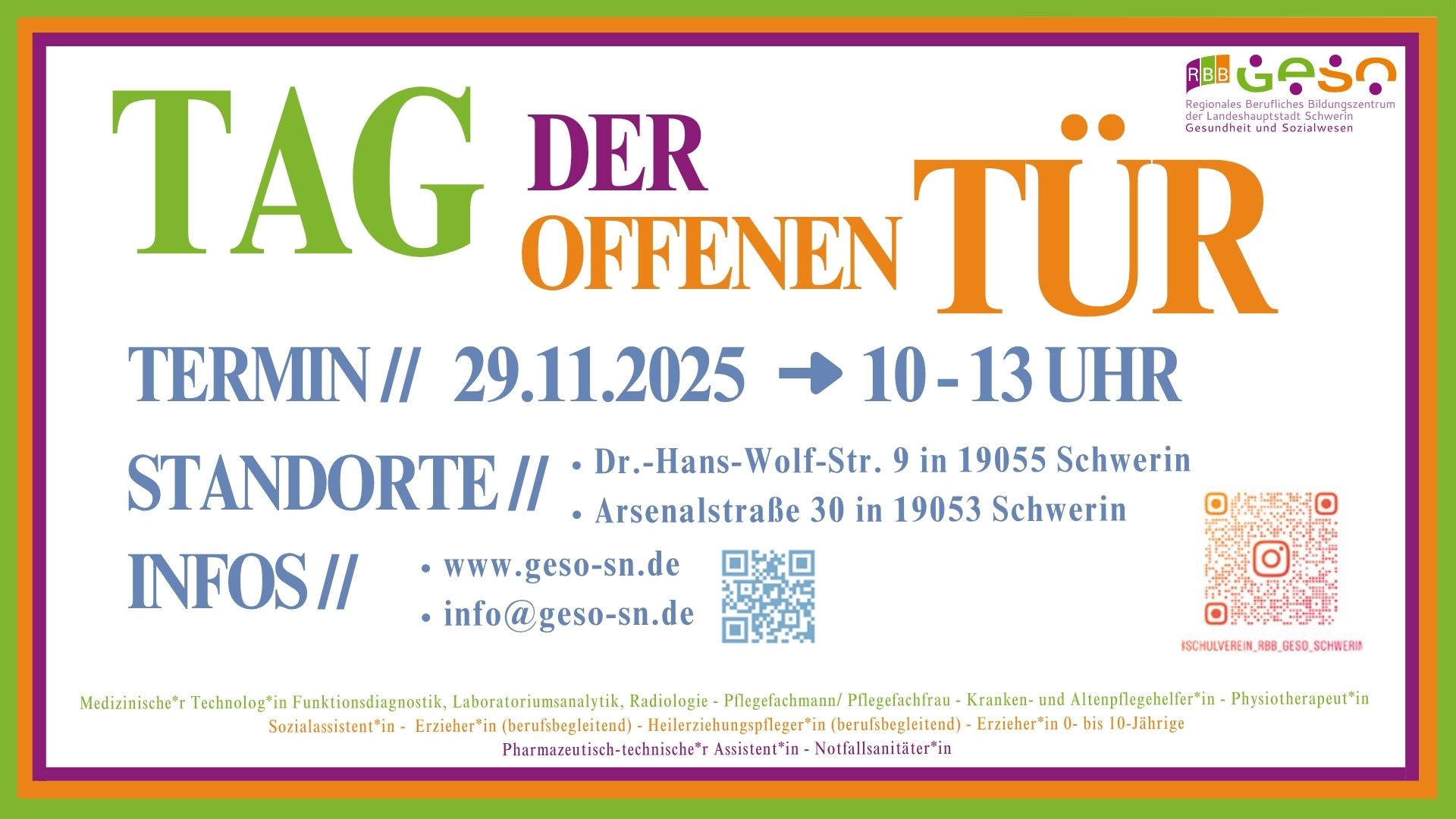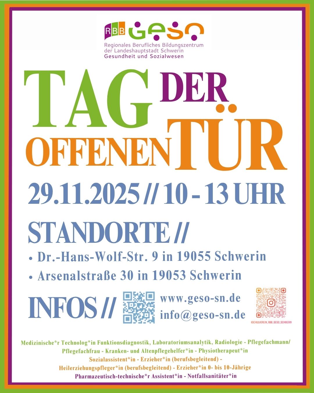 Das Regionale Berufliche Bildungszentrum Gesundheit und Sozialwesen der Landeshauptstadt Schwerin lädt am 29.11. zu einem Tag der offenen Tür an den Standort Gesundheit in der Dr.-Hans-Wolf-Straße 9 und an den Standort Sozialwesen in die Arsenalstraße 30 ein.